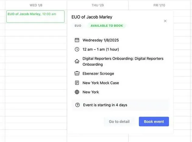 Our system allows for out-of-state booking to help ensure balanced scheduling and consistent event volume for Digital Reporters. If an event is not booked by a reporter located in the same state where it is taking place, it will automatically open to reporters in other states.