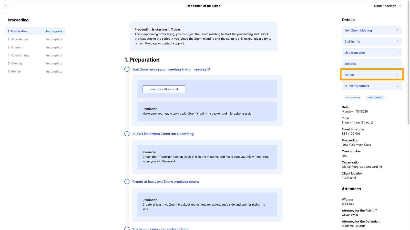 It is required to review the notice in advance of the event’s start time to familiarize yourself with the details of the case and any context that could help the deposition run smoothly. This is also a time to ensure the details of the notice match the event details.