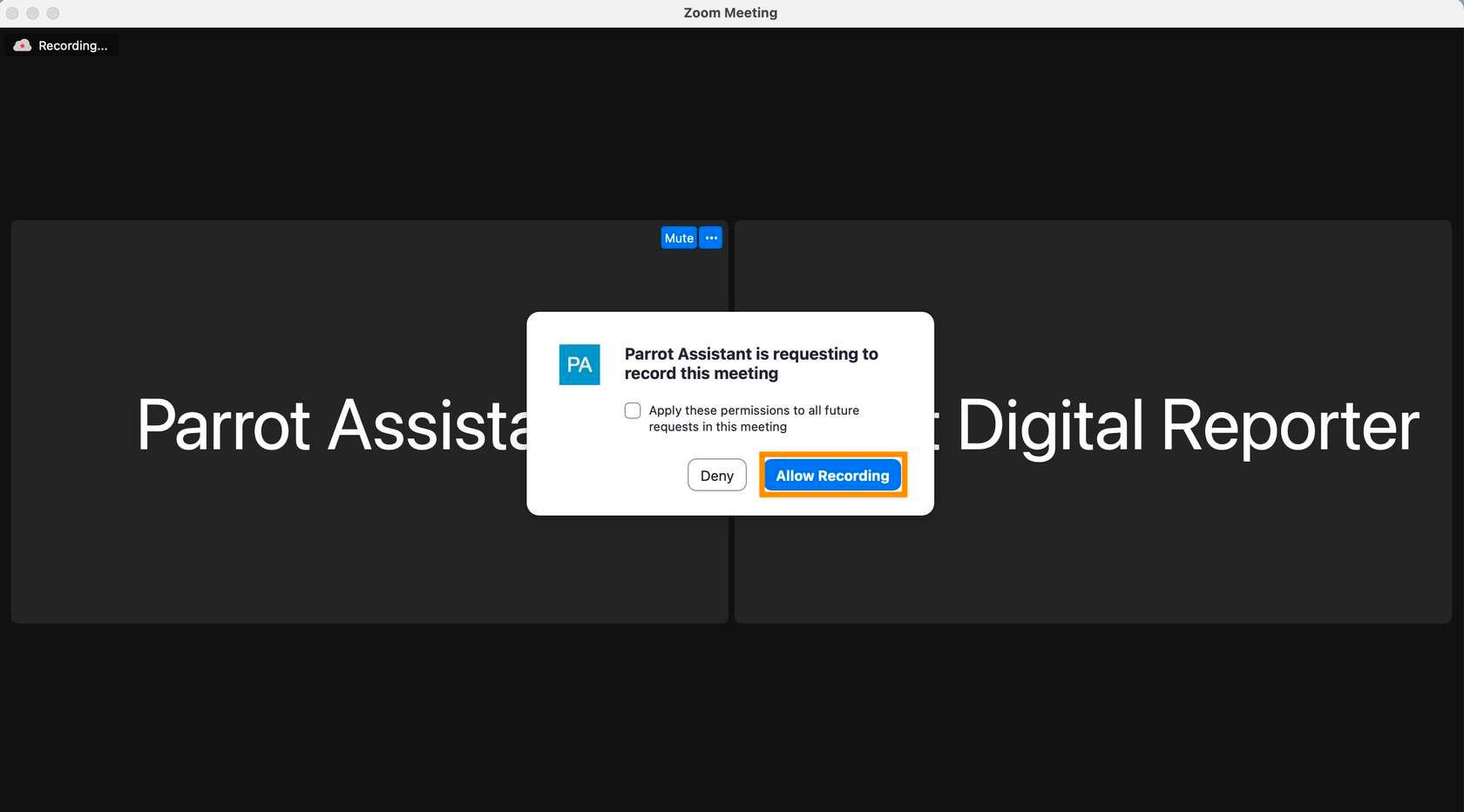 In order to have the live transcript during the event, we have a Parrot Assistant attendee that joins at the beginning of the Zoom. This is not an actual person, but a bot that is handling the recording for the livestream. You will see the pop-up below when you join. You must click Allow Recording. Do not click Deny or the checkbox to "Apply these permissions to all future requests in this meeting."